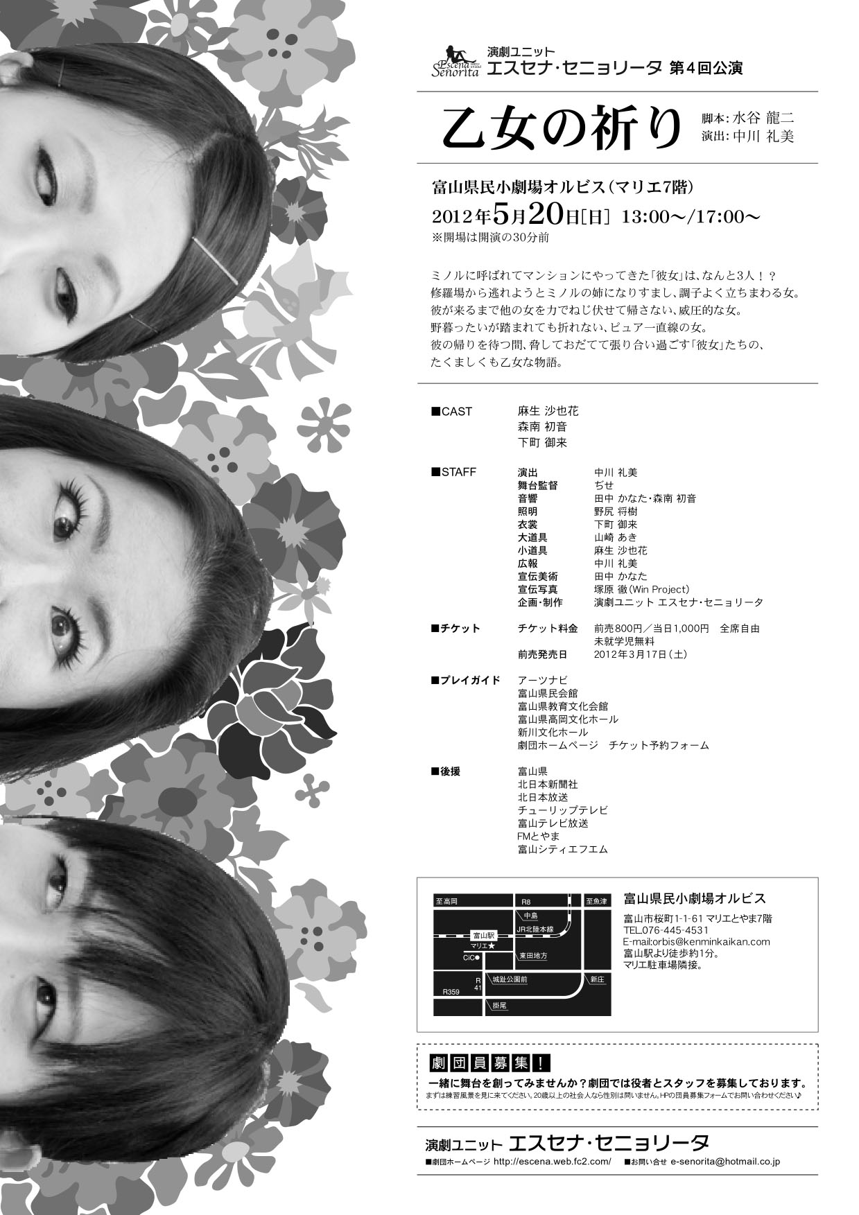 ■あらすじ ミノルに呼ばれてマンションにやって来た「彼女」は、 なんと3人!? 修羅場から逃れようとミノルの姉になりすまし、調子よく立ちまわる女。彼が来るまで他の女を力でねじ伏せて帰さない、威圧的な女。野暮ったいが踏まれても折れない、ピュア一直線の女。彼の帰りを待つ間、脅しておだてて張り合い過ごす「彼女」たちの、 たくましくも乙女な物語。 ■後援 富山県 北日本新聞社 北日本放送 チューリップテレビ 富山テレビ放送 FMとやま 富山シティエフエム |