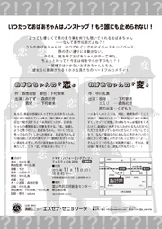 作 |「おばあちゃんの恋」森南初音(脚色:下町御来) 「おばあちゃんの変」中川礼美 演 出|中川礼美 出 演|森南初音/下町御来/くずもち(声の出演)